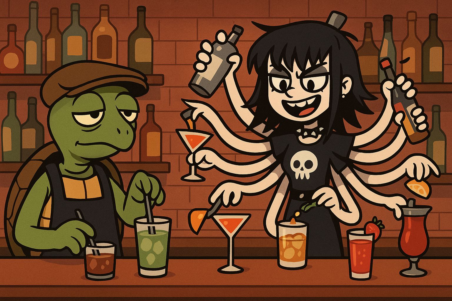 Chosi: two cartoon characters called leo and jess working behind a cocktail bar. leo is very chill and slow, he is a turtle wearing a flat cap with his name on it. jess is a quirky emo metal chick with 8 arms and bangs doing all the work.