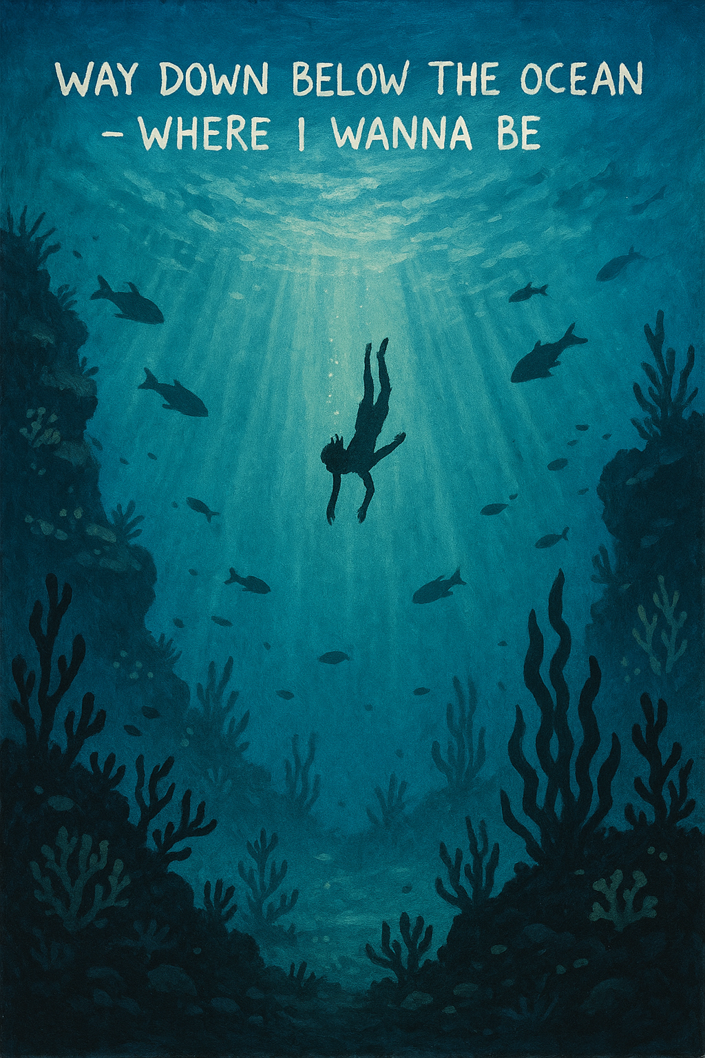 shurke: a bengal cat swimming in the ocean with diver goggles watching dolphins and sea turtles over a colorful reef