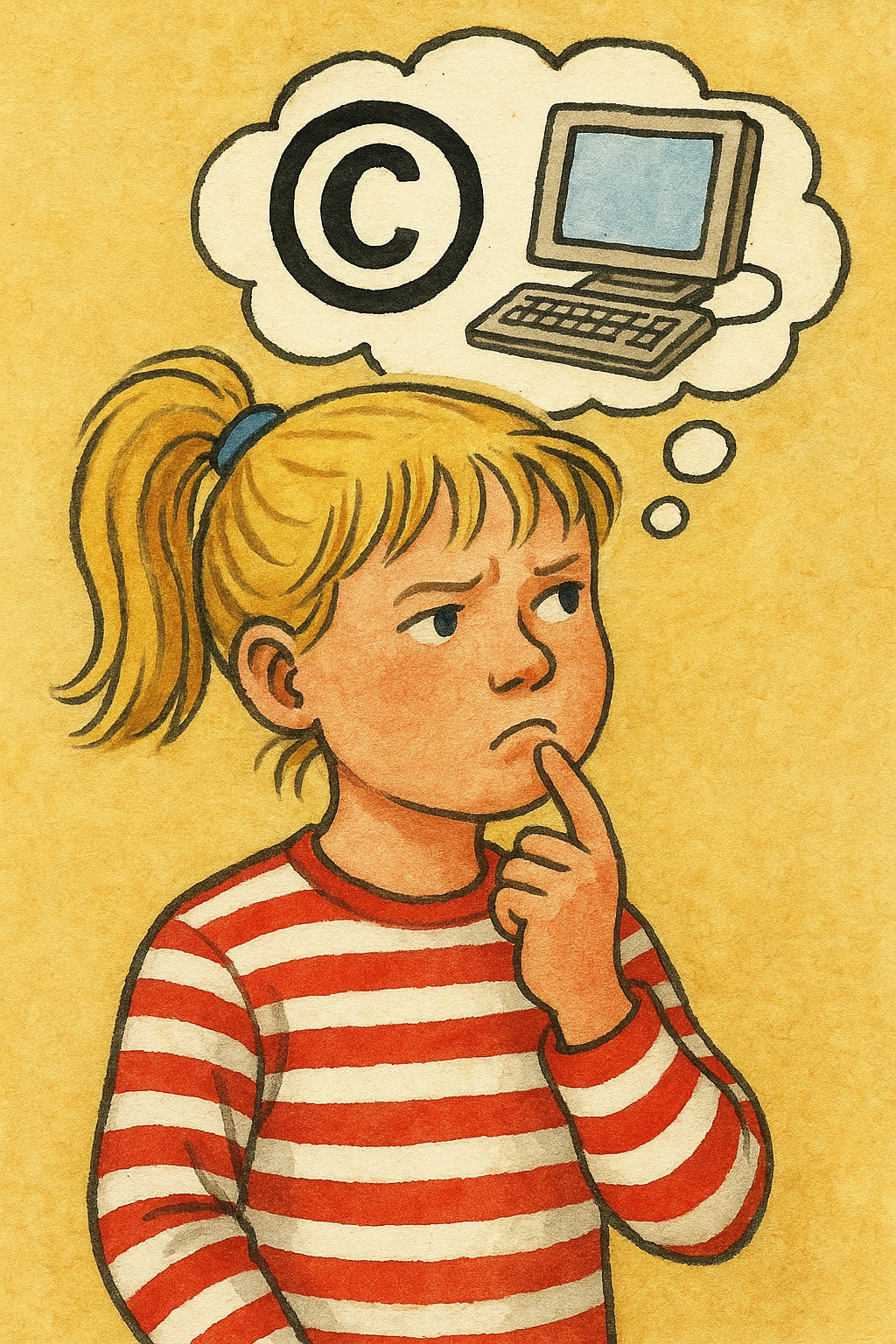 beeble: kind mit blondem pferdeschwanz, rotes ringelshirt denkt darueber nach urheberrechtsverletzung im internet zu begehen - im stil eines deutschen kunderbuchs aus den 90ern