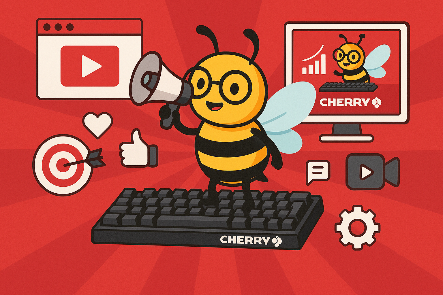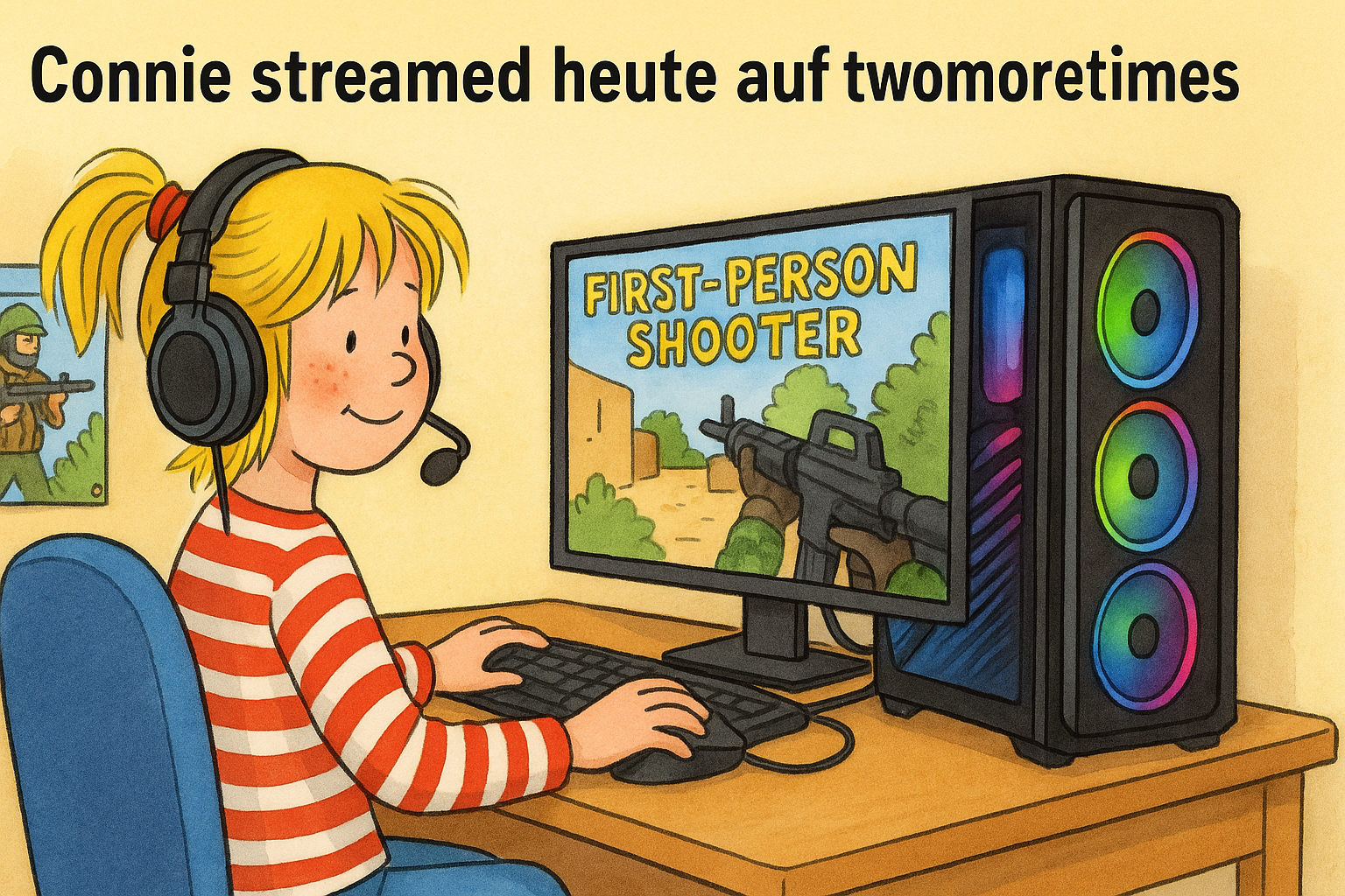 beeble: Erstelle ein Bild im 16:9-Format. Es soll ein Meme im Stil der Conni-Kinderbuecher sein, gezeichnet, mit einem blonden maedchen mit pferdeschwarz und rotes ringelshirt das an einem schreibtisch sitzt mit einem RGB beleuchtetem gaming PC. sie spielt einen first person shooter und darueber soll der text stehen "connie streamed heute auf twomoretimes". an der wand haengt ein poster des spieles