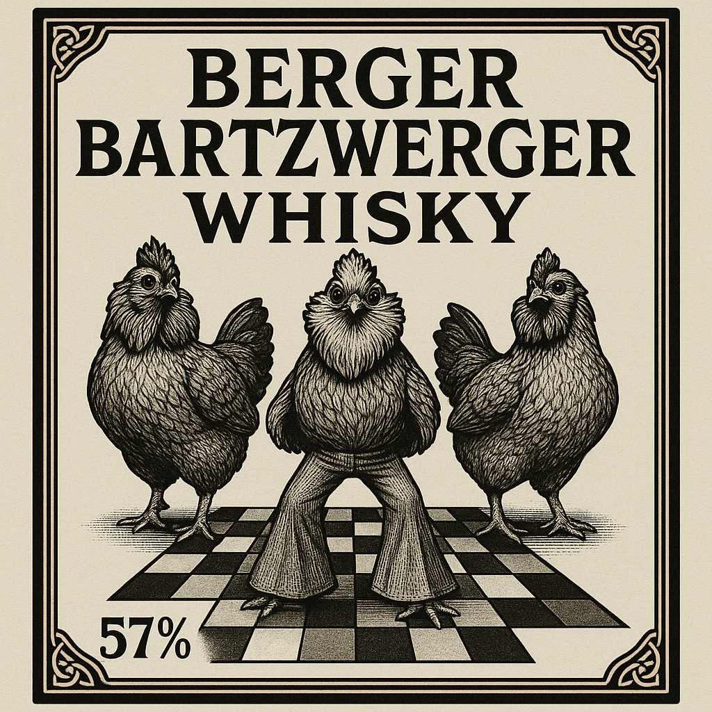 shurke: a label for a whiskey bottle named "Berger Bartzwerger Whisky" on top and including the amount of alcohol on the label "57%" at the bottom left in black and white with three Barbu d'Anvers, one in the middle and the other two on each side. the middle one has a flared disco trouser and the floow beneath it is colored squares like a 70ies dancefloor
