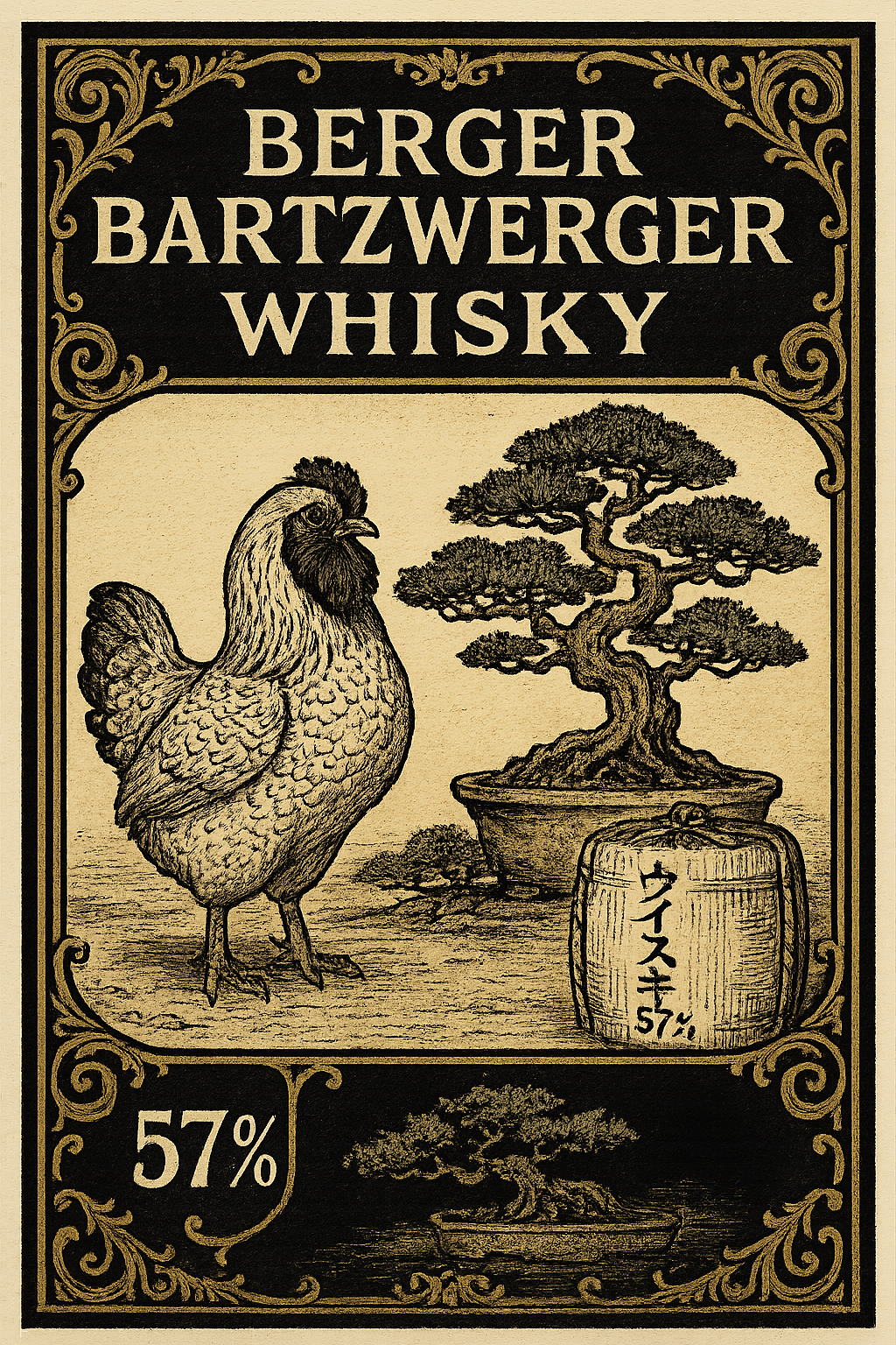 shurke: a label for a whiskey bottle named "Berger Bartzwerger Whisky" on top and including the amount of alcohol on the label "57%" at the bottom left in black and white with a Barbu d'Anvers. make it's in ukiyo-e style. include a 500 year old bonsai tree and a sake barrel with japanese text saying "whiskey, 57%". make the label classy like an ardbeg logo with golden fancy fringes.