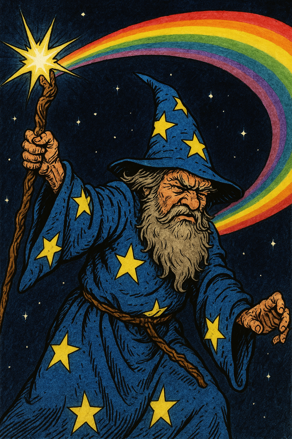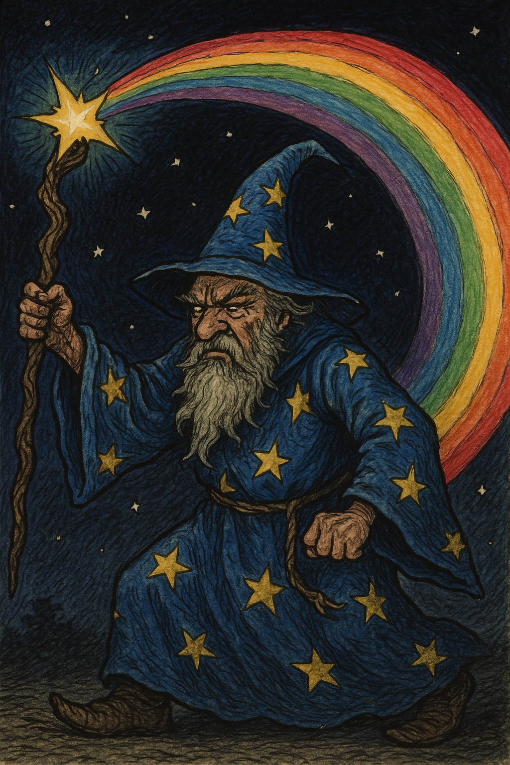 shurke: a wizard in a blue robe with stars on it mumbling grumpy into his grey beard, he has a pointy hat with the same coloring as his robe. his gnarly staff has a bright star embedded in the tip and he is swinging it in an arc above his head. the star paints a bright rainbow streak across the midnight sky. artstyle is oldschool fantasy hand drawn picture