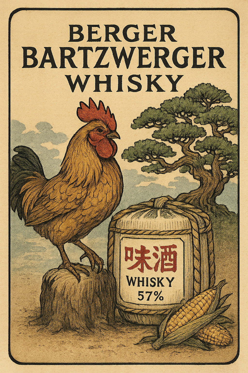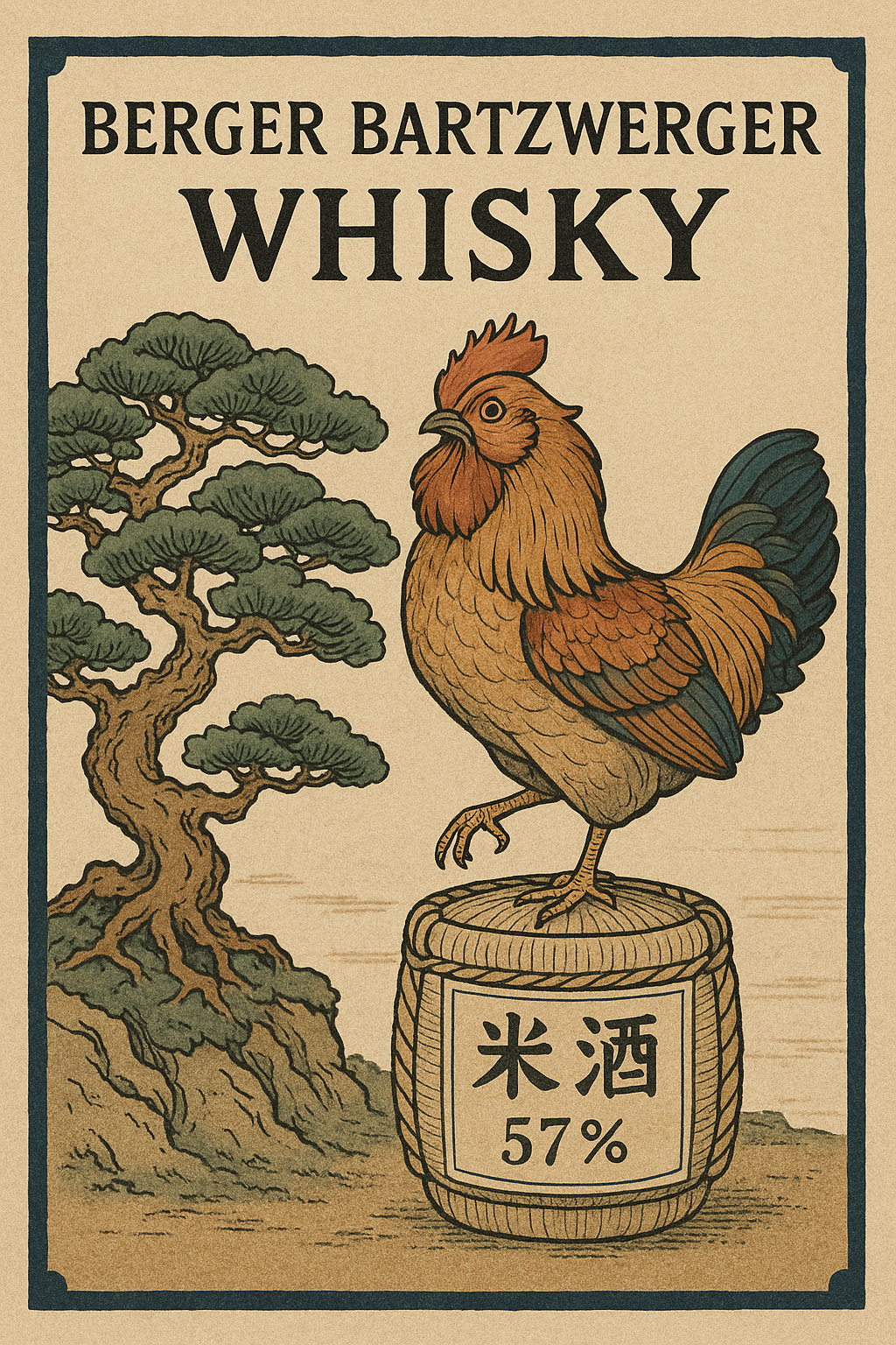 shurke: a label for a whiskey bottle named "Berger Bartzwerger Whisky" on top with a Barbu d'Anvers. make it's in ukiyo-e style. include a 500 year old bonsai tree and a sake barrel with japanese text saying "whiskey, 57%". the bird has one foot on the barrel. the barrel has the characteristic white linen of japanese sake barrels. near the barrel is a pile of corn, which reminds the viewer of it's