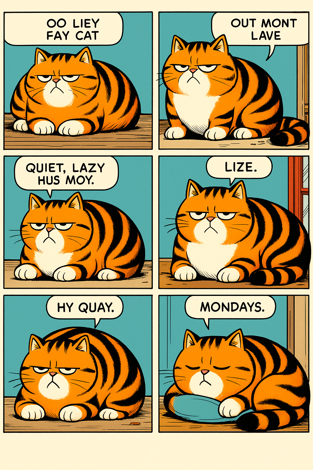 shurke: fleischkaese in einem broetchen, 5cm dicke scheibe, mit einem mann mit leuchten in den augen with a cat licking it, stating "bueno!"