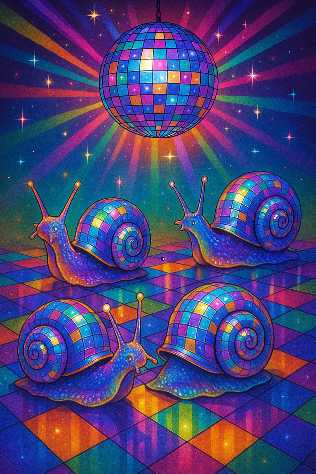 shurke: a label for a whiskey bottle named "Berger Bartzwerger Whisky" on top and including the amount of alcohol on the label "57%" at the bottom left in black and white with three Barbu d'Anvers, one in the middle and the other two on each side. the middle one has a flared disco trouser and the floow beneath it is colored squares like a 70ies dancefloor. make the label classy like an ardbeg logo