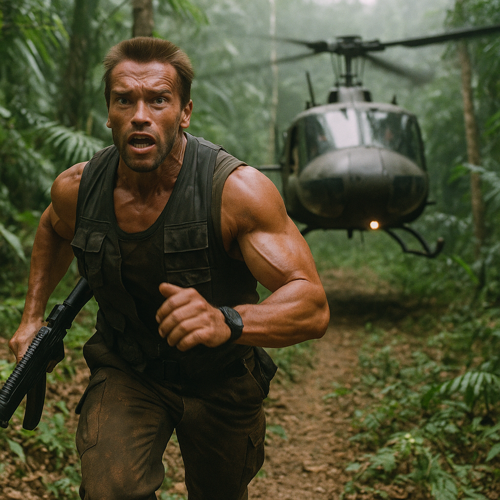 beeble: a caucasian man wearing a shirt with a piece sign kicking in a door of an orphanage while getting chased by dogs. babies wearing pilot helmets driving strollers with jet engines trying to escape the scene