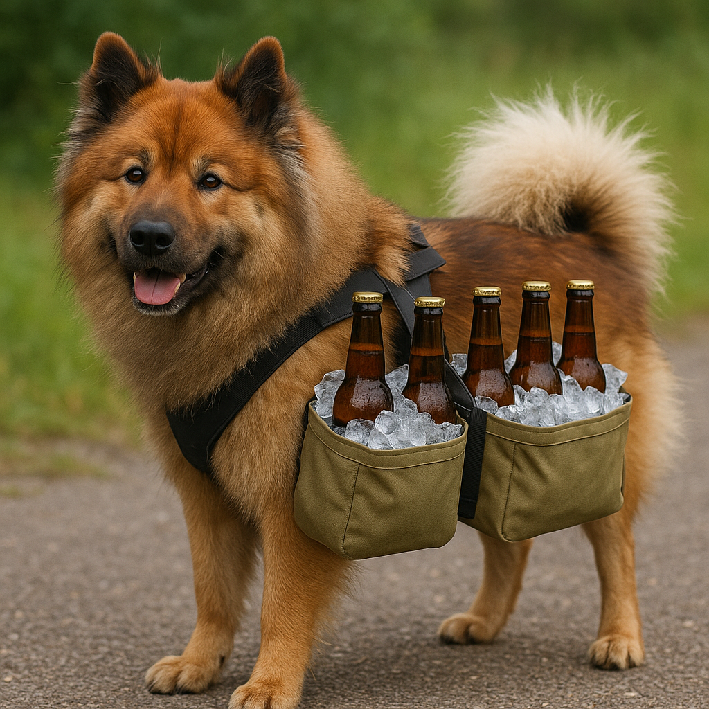 tium: a dog of the "eurasian" breed, with a carrying harness strapped to his back, which contains 3 beer bottles on the left and 3 beer bottles on the right side, every bottle is cooled by crushed ice surrounding the bottle holder.
